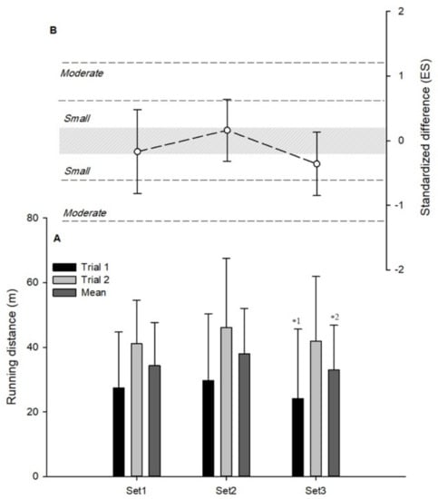 Within-session variations in running distances of small-sided games. (A) Mean ± SD of different sets (* small; e.g., * 1;2: Different from sets 1 and 2 with a small effect). (B) Standardized difference between individual sets and mean values derived from of all sets.