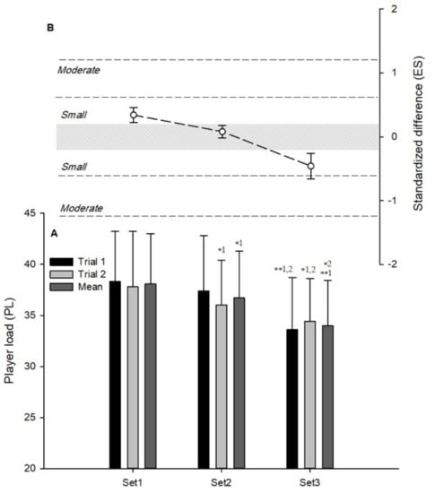 Within-session variations in player load of small-sided games. (A) Mean ± SD of different sets (* small, ** moderate; e.g., ** 1;2: Different from sets 1 and 2 with a moderate effect). (B) Standardized difference between individual sets and mean values derived from of all sets.