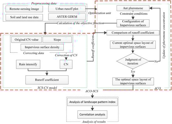 The integrated framework of this research is shown in Figure 1. Firstly, data preprocessing was carried out to obtain impervious surfaces, slope, urban runoff plot, and initial CN value. Secondly, the ACO-SCS coupling model is built to design the probability function, heuristic function, adaptive function and pheromone concentration update function in the ACO. Then, the optimal combination of parameters is constructed, and the optimal impervious surface is obtained by running the model. Finally, the landscape pattern index analysis and correlation analysis are carried out according to the optimization results.