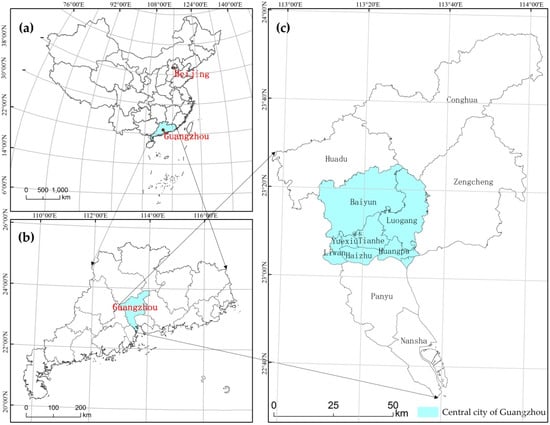 Study area: (a) location of Guangdong province in China; (b) Guangzhou’s location in Guangdong province; (c) central city of Guangzhou.