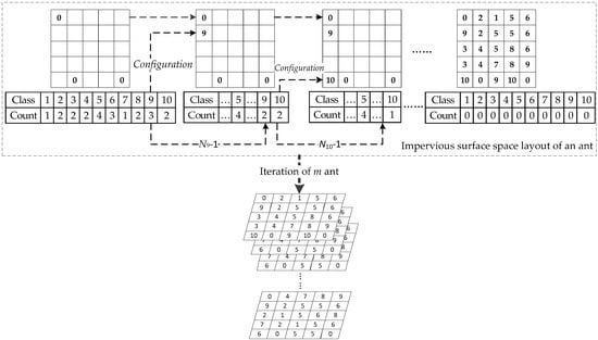 If , the impervious surface type in grid cell with the highest probability, is the same as the current type of impervious surfaces, the type of impervious surfaces in grid cell is still . Otherwise, it is configured according to the principle of a random turnplate. Each impervious surface type k is configured to reduce the number of containers corresponding to the impervious surface type k by one. ACO-SCS repeats the above process until all grids are configured with impervious surface types. According to such a principle, the impervious surface space layout represented by all ants is configured. The specific process is shown in Figure 3. The number of impervious surface types is N.