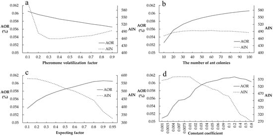 Relationship between parameter setting and average optimization rate (AOR) and average iteration number (AIN): (a) pheromone volatilization factor; (b) the number of ants; (c) expecting factor; (d) constant coefficient.