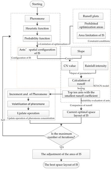 This study integrates SCS-CN and ACO to optimize the impervious surface space layout. The spatial layout of impervious surfaces is taken as their common parameter, and SCS-CN is set to the objective function of ACO to evaluate the optimization results. The coupling programming of the model and the algorithm is realized by the MATLAB 2014a software (MathWorks, Natick, MA, USA). The main process is as Figure 5: