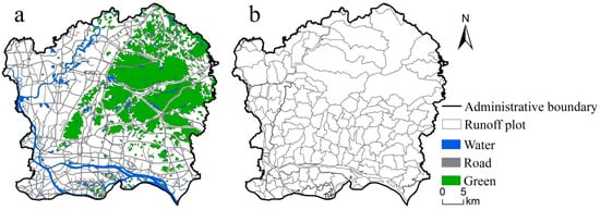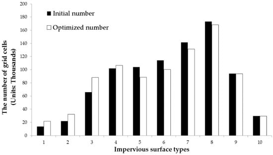 The urban runoff plot was divided by combing the urban watershed division technique with the detail control planning area index, which realized the combination of hydrological and ecological units with traditional planning units. Such a combination makes the urban runoff plot more natural and ecologically significant and simultaneously considers the urban-rural planning significance []. Therefore, the runoff plot is taken as the optimization unit in this study (Figure 6b), which meets the requirements of the urban planning unit. Optimization was only carried out in the runoff plot to reduce the update difference before and after optimization. The city is an important area of life and production. Considering that urban renewal cannot lower the quality of living and production, the area of construction land cannot be significantly reduced. Therefore, before spatial optimization, the number of impervious surface types in the runoff plot was first counted and then extracted one by one in the process of space allocation to ensure that the impervious surface area meets the constraint conditions after optimization.
