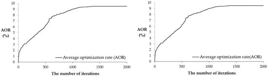 ACO-SCS aims to minimize the runoff coefficient and is used to optimize the impervious surface space layout of the research area. As shown in Figure 7, the number of iterations is set to 2000 times. In the initial stage, the average optimization rate increased rapidly but gradually slowed as the number of iterations increased and finally reached the highest value at approximately 1400 times. This indicates that the surface runoff coefficient is the minimum under the condition of the current impervious surface space layout.
