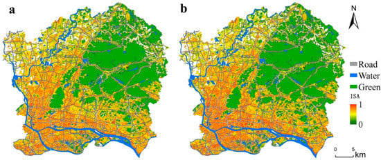Impervious surface spatial distribution before and after optimization: (a) impervious surface spatial distribution before optimization and (b) impervious surface spatial distribution after optimization.