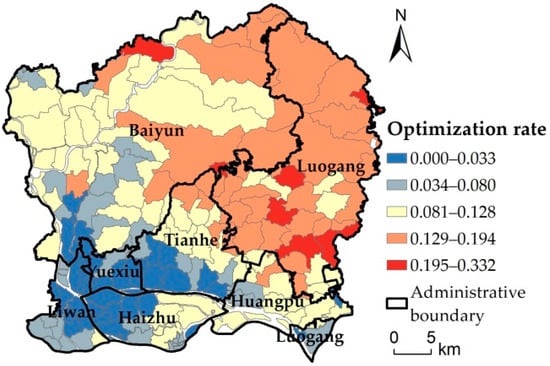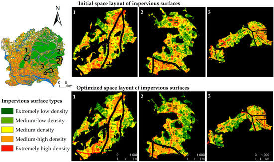 The optimized impervious surface space layout is shown in Figure 8. Water bodies, green spaces, and urban arterial roads are prohibited to be optimized. The water bodies are mainly the Pearl River, reservoirs, and large ponds in the city, while the green spaces are mainly the northeast region, such as Baiyun Mountain and Maofeng Mountain. Macroscopically, the impervious surface space layout has not changed significantly. The high-density impervious surfaces are still preserved in the central urban areas, such as Tianhe, Yuexiu, Liwan, and Haizhu, mainly because this study uses a runoff plot as the optimization unit and the impervious surfaces in each runoff plot are optimized independently. Additionally, the spatial distribution of impervious surfaces within the runoff plot varies greatly before and after optimization. To observe the optimal results of the impervious surface space layout from the scale of the runoff plot, three runoff plots with high optimization rates and global distributions were selected for display from the perspective of the optimization efficiency and the spatial balance of runoff plots. The effect is shown in Figure 9. In terms of spatial layout, extremely low-density, medium-low density, and medium-high density impervious surfaces are more clustered, while extremely high-density impervious surfaces are shown as long strips of agglomeration. Medium density impervious surfaces become more fragmented.