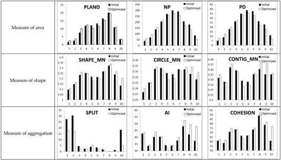 The landscape pattern index is a simple quantitative index that can highly concentrate landscape pattern information and reflect its structural composition and spatial configuration. This index can be used to conduct quantitative research on the composition, spatial configuration, and dynamic change of landscapes [,]. Since the landscape pattern index is an effective tool for quantifying the structure and pattern of thematic maps and helps explain the urban spatial structure, it has gradually been applied to urban environmental research. Therefore, to compare the spatial layout differences of impervious surfaces before and after optimization, the landscape pattern index under the scale of patch class was used to study its changes. The specific landscape pattern index is shown in Table 3.