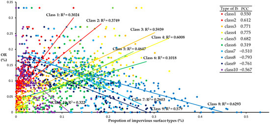 By counting the changes in the number of impervious surface types (Figure 10), the number of impervious surface types of medium-low density and extremely low density was on the rise, while the number of impervious surface types of medium and medium-high density was on the decline. Specifically, impervious surface types 5, 6, and 7 decreased, while the extremely high density impervious surfaces did not change significantly. In general, the average impervious surface density decreased from 0.5765 to 0.5572, consistent with the 5% variation range of impervious surfaces. Under the annual rainfall intensity, the average optimization efficiency can reach 9.52%. The highest optimization rate was 33.16%, and the number of runoff plots with an optimization rate over 10% was 67, with a good optimization effect. In terms of spatial distribution of optimization rate, the spatial heterogeneity of the optimized results was found from the demonstration of the optimized results in each runoff plot (Figure 11). The model optimization effect achieves the best effect in the urban fringe with low urban construction land density, while the optimization effect is not obvious in the urban core areas with high construction land.