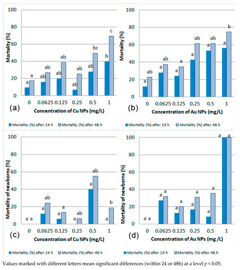 Current knowledge about copper and gold nanoparticles is limited and does not show the full toxic effects on organisms living in aquatic ecosystems. The effect of nano-copper and nano-gold (in the colloidal form available on the market) on zooplankton has not yet been well recognized. Therefore, the influence of aqueous solutions with increasing concentrations of Cu NPs and Au NPs on the model organism—Daphnia pulex—was examined in the study presented.