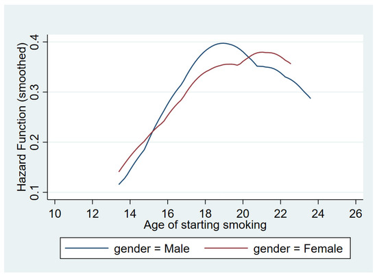 The prevalence of individuals who have ever smoked is around 30%. The prevalence for those who currently smoke is around 23%, so the sample includes 7% former smokers. The probability of being a smoker, current or former, is larger for men, 33%, than for women, 27%. In Argentina, 45% of the population with primary education is either a former or current smoker, and this figure is 42% for those with a university education. The prevalence of ever having smoked has a negative relationship with socioeconomic status. The mean starting age of smoking is 15 years old. It is a little bit larger for men, almost 16, than for women, 15 years old. Figure 1 shows the hazard of initiating the habit. Male teenagers have the highest risk of picking up a smoking habit around the age of 19 while for females the highest risk is around 21 years old. The hazard of initiating the addiction increases sharply around the age of 13 for both men and women and falls after the age of 19 for men and 21 for women. This increment in the hazard function is steeper for men than women such that after the age of 15 and until the age of 20 the hazard rate is higher for men than for women. Before the age of 15 and after the age of 20 the hazard rate is higher for women.