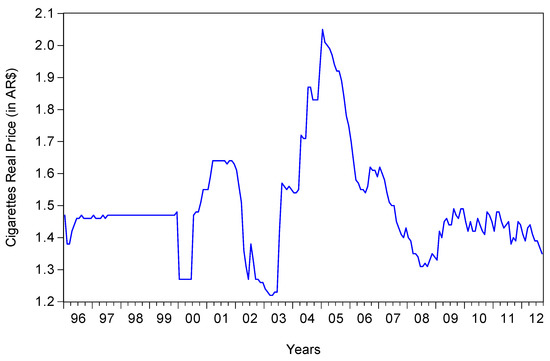 Cigarette price variable is the average retail price of a 20 cigarettes pack published by the National Ministry of Agriculture (MINAGRI), [16]. We transformed the price variable into real terms by deflating it by the Argentinian Consumer Price Index (CPI). Figure 3 depicts the time evolution of cigarettes’ real price from January 1996 to September 2012, the date of the GATS survey. The average real price of a 20 cigarettes pack in the sample is argentine pesos (ARS) 1.50. The maximum price was ARS 2.05 while the minimum real price was ARS 1.22. The figure shows no upward or downward trend for real price over the whole sample.