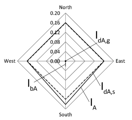 In the radar chart, the contributions IbA, IdA,s, IdA,g are indicated for the four analysed vertical surfaces (each of which facing one of the cardinal points). Comparing the values of Table 3 and the chart of Figure 2, it can be observed that the IdA,g values are negligible for all the four vertical surfaces considered, accounting for less than 1% to the respective IA values. The IdA,s values are clearly predominant for all the considered surfaces. For the analysed conditions, the IbA values represent a significant contribution to IA exclusively for the surface facing south, accounting for the 11% to the respective IA value.