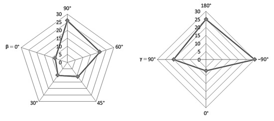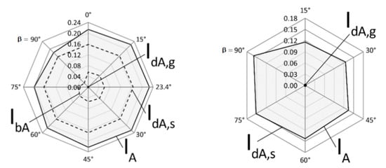 With the aim of highlighting the relative weights of the various components that contribute to global Erythemal UV radiation IA, according to step S24 of Figure 1, radar charts are shown in Figure 3. In the radar charts, the contributions IbA, IdA,s, IdA,g are indicated for the analysed sloped surfaces facing south (left side chart) and north (right side chart). Comparing the values of Table 4 and Table 5 and the charts of Figure 3, it can be observed that the IdA,g values are negligible for all the four vertical surfaces considered, accounting for less than 1% to the respective IA values. The IdA,s values are clearly predominant for all the considered surfaces. For the analysed conditions, the IbA values represent a significant contribution to IA exclusively for the surface facing south, accounting from the 12% (obtained for β = 90°) till to the 27% (obtained for β = 23.4°) of the IA respective values.
