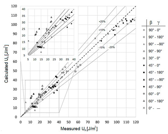 In order to evaluate the accuracy of the algorithm in calculating the Erythemal UV dose for surfaces with different inclinations and directions, the results obtained applying the algorithm have been compared with the measurement results. The comparison, carried out on the basis of the parameter UA, is graphically shown in Figure 4; as it can be observed, the measured and calculated data show a sufficient level of agreement, also in light of the complexity of the problem. The value of the mean absolute error, between calculated and measured data, is 20%. The 50% of the measured values are predicted by the algorithm with a deviation lower than 10%, and the 75% of the measured values are predicted by the algorithm with a deviation lower than 18%. It is useful to note that the higher values of the deviations are observed for low values of UA (see Figure 4), for which also the exposure risks are less significant. If only UA values higher than 40 J/m2 are considered, the value of the mean absolute error, between calculated and measured data, is 7%. The highest deviations were observed for the measurements taken in the site of Guadagnolo, in particular for the vertical surfaces (β = 90°) facing north and east (γ = 180° and γ = −90° respectively), for which the calculated values are higher than the measured ones. This is probably due to the fact that the forecasting algorithm cautiously does not consider the reductions in the contribution of solar radiation produced by the presence of mountains and hills in the horizon height, more significant in this site with respect to the other analysed sites, which diminished the visible surface of the sky. In Figure 5, average values of the percentage deviations are shown; they were derived by grouping the data (measured and calculated) obtained for the same β values (left side chart) and for the same γ values (right side chart). From the charts of Figure 5, it is possible to observe that the deviations are very low for surfaces with low inclination with respect to the horizontal plane (β ≤ 45°) and for surfaces facing south (γ = 0°), with values of about 10% and 7%, respectively. This is probably due to the fact that in these surfaces the direct component, which is easier to compute respect to the diffuse one, is predominant.