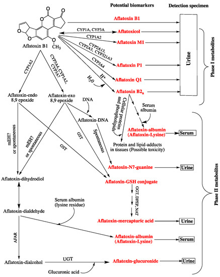 Aflatoxins B1 and its metabolites excreted in the urine are also routinely used as biomarkers (Figure 1). The so-called phase I metabolites of AFB1, such as AFM1, AFP1, AFQ1, aflatoxicol, and AFB2a produced in the liver by various cytochrome P450 enzymes (Figure 1) have been considered as exposure biomarkers for internal dose determinations and for possible correlation between their levels and risk of HCC development. The excretion of AFM1 and AFP1 was first demonstrated in the urine from mice fed on AFB1-contaminated rations [122]. The study also reported these metabolites (AFM1 and AFP1) were excreted in urine from humans exposed to AFB1 through the diet, and a dose-response relationship between AFM1 and HCC has been established in cohort studies in Taiwan [123]. Also, the amount of AFM1 in the urine of individuals from the aflatoxin-endemic Guangxi region of China was correlated with AFB1 intake, and a proportion of 1.23 to 2.18% of dietary AFB1 was excreted in the urine as AFM1 [124]. The presence of AFP1 in urine samples was directly related to the risk of liver cancer [63], but no linear relationship between its levels in the urine and exposure to AFB1 could be demonstrated [110]. Meanwhile AFQ1 was rarely detected in urine samples from people or animals fed on AFB1-contaminated foods or feeds [122].