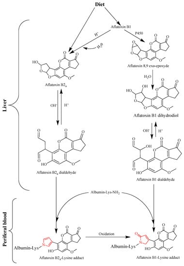 Currently, aflatoxin-albumin adduct in blood serum is the most reliable biomarker for a long-term exposure to AFB1 owing to its longest half-life (20 days on average) compared with any other known urinary adduct, and it persists in the serum for more than 3 months [84,111]. A highly positive correlation between aflatoxin dietary intake and the level of aflatoxin-albumin adduct in human serum has been repeatedly demonstrated in humans and animals; and a percentage of 1.4 to 2.3 of ingested aflatoxin was shown to bind covalently serum albumin [112,113]. A series of studies using this adduct as a biomarker demonstrated a strong dose-response relationship between aflatoxin exposure in utero or during early infancy and growth impairment [114]. Nonetheless, the significance of this biomarker as a molecular dosimeter for quantitative risk assessment or as a predictive parameter to identify individuals prone to develop HCC was questioned [115]. The controversy arises from the fact that the metabolism of AFB1 via the genotoxic epoxide formation pathway is not the only source for the generation of aflatoxin-albumin adduct [116]. In the genotoxic pathway (Figure 1), this adduct derives from the metabolism of AFB1 in the liver where it is first oxidized by cytochrome P450 enzymes (CYP3A4, CYP1A2, and CYP3A7) to form AFB1-exo-8,9-epoxide (the highly reactive genotoxic metabolite) and AFB1-endo-8,9-epoxide (less active). These unstable epoxides are spontaneously transformed into AFB1-8,9-dihydrodiol which undergoes a base-catalyzed ring opening to aflatoxin-dialdehyde that in turn reacts by Schiff base formation with the lysine side chain of serum albumin to form the AFB1-lysine adduct (Figure 1 and Figure 2). This pathway leads to the formation of the adduct that can adequately inform on AFB1 exposure and its potential to induce HCC. However, aflatoxin-albumin adduct was recently suggested to also derive via an alternative pathway from AFB2a [116]. Accordingly, AFB2a, from the diet or as an AFB1 metabolite, is directly oxidized to AFB2a-dialdehyde and reacts by a dual condensation with serum albumin to form AFB2a-albumin adduct with a pyrrole ring, contrary to aflatoxin B1-albumin adduct that has a typical pyrrolin-2-one ring [116]. Under oxidative conditions, the pyrrole ring of the aflatoxin B2a-albumin adduct is oxidized to yield the adduct (with a pyrrolin-2-one ring) as that formed via the genotoxic pathway directly from aflatoxin B1 (Figure 2). In the light of these findings, the authors concluded that aflatoxin-albumin adduct may not always be a reliable indicator of aflatoxin B1 intake and its subsequent metabolism through the genotoxic pathway. This is consistent with an earlier report on the lack of significance of serum albumin-adduct levels for quantitative risk determination and for accurate prediction of the risk for HCC development [115]. The lack of correlation may be further enhanced by the fact that the aflatoxin-dialdehyde does not react entirely with serum albumin and part of it is reduced with aflatoxin aldehyde reductase (AFAR) into aflatoxin-dialcohol, which then reacts with glucuronic acid under the action of a UPD-glucuronosyltransferase to be detoxified in the form of aflatoxin-glucuronide and excreted in the urine (Figure 1). Moreover, part of the AFB2a produced in the liver binds covalently to cellular proteins and phospholipids (Figure 1) instead of binding albumin [116]. These various pathways and fates of precursor and intermediate metabolites make the quantitative correlation between the ingested AFB1 and the resulting aflatoxin-albumin adduct dependent on different factors that drive the metabolic reactions in favor of one or another pathway. Nonetheless, aflatoxin-albumin adduct is currently the most reliable biomarker which was validated to determine aflatoxin “chronic” exposure.