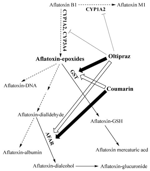 Action of oltipraz and coumarin on the metabolism of aflatoxin B1 against aflatoxin-induced hepatocarcinogenicity. The dominant action of each agent is indicated by a large filled arrow while a lesser inducing effect is indicated by large hallow arrows; T-shaped lines indicate inhibition of the enzymes; dashed arrows indicate reduced rate of the reaction; plain arrows indicate the routes favored by the action of the inducers [127,143]. (For abbreviations, see captions of Figure 1).