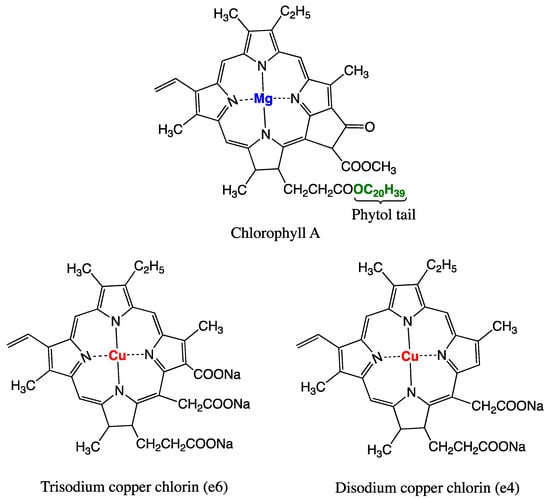 Chlorophyll A molecule naturally found in green plants, algae, and photosynthetic bacteria, and the two main semi-synthetic derivatives, disodium copper chlorin e4 and trisodium copper chlorin e6, commonly used in commercial chlorophyllin food supplements.