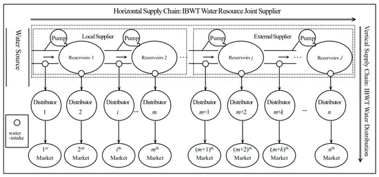 An IBWT system can be viewed as an ‘embedded’ supply chain structure, in which a horizontal water supply system is embedded in a vertical water distribution system (see Figure 1). The horizontal supply chain is comprised of a local supplier and an external supplier, and they serve as a joint IBWT supplier via an efficient cooperation mechanism. The vertical supply chain distributes water by the joint IBWT supplier through multiple water distributors to many water consumers in the service region. Specifically, water resources are transferred and supplied by the local supplier from the water source to the external supplier within the trunk channel, and then distributed to water resources distributors of all water-intakes via river channels and artificial canals. Finally, the water resources are sold by each distributor to the water resources consumers in the distributor’s region. According to the actual operating situations of IBWT projects, the IBWT water supply capacity is generally sufficient to meet all downstream demands. Furthermore, what needs to be noted is that water consumers can only buy water from their regional water distributors due to the fixed physical structure of the water transferring channel and the corresponding facilities and equipment. This feature determines that there is no competition among water distributors.
