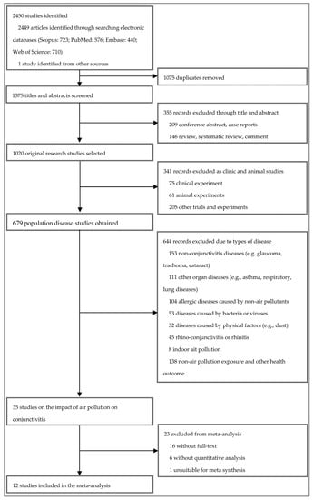 Conjunctivitis disease is generally divided into two categories: infectious by pathogenic microbial factors and non-infectious by physicochemical factors. Conjunctivitis is the most common eye disease diagnosed in emergency departments and affects all ages, which has caused serious health and economic burdens around the world. For instance, in the United States, conjunctivitis accounts for almost one third of all eye-related diseases, with 4–6 million conjunctivitis visits annually and a treatment cost of nearly 800 million dollars [7]. In addition to the societal costs, conjunctivitis can directly influence the patients’ quality of life. Mild conjunctivitis can affect people’s learning and working, and severe conjunctivitis can cause irreversible damage to the eyes, such as decreased vision or even blindness [4]. Additionally, patients with conjunctivitis, particularly allergic conjunctivitis, always have coexisting symptoms, such as allergic asthma and rhinitis [8]. Therefore, identifying the environmental risk factors for conjunctivitis and then guiding the development of effective measures for reducing the incidence of conjunctivitis are important for public health in the field of ophthalmology. Recently, several studies have provided evidence that exposure to air pollution could significantly increase the risk of conjunctivitis development [9,10,11,12]. However, there is still significant controversy on which air pollutants pose the highest risk and which subpopulation of patients with conjunctivitis is particularly sensitive to air pollution. For example, Bourcier and colleagues [13] reported that NO2 is associated with a higher risk of conjunctivitis in the population than that of O3, while Larrieu et al. showed the opposite results [14]. In addition, Hong and co-authors found that the effect of O3 is greater for women with conjunctivitis than men, whereas the study of Fu et al. presented the opposite trend [5,6]. These inconsistent results indicate the necessity of quantitatively synthesizing and interpreting the current available evidence in order to provide comprehensive evidence for policymakers and protect the public’s health.