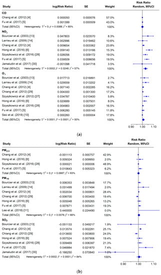 Forest plot of the association between conjunctivitis and exposure to air pollution: (a) CO, NO2, O3; and (b) PM2.5, PM10, SO2. Risk ratio was calculated by considering a 10 μg/m3 increase of air pollution.