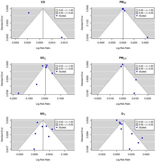 Sensitivity analyses were performed to estimate the stability of the results by recalculating the pooled effect estimates after omitting one study each time [32,33,34]. We found that the effect estimate of each 10 μg/m3 increase in the six air pollutants showed no significant change by removing one single study, suggesting that the combined results were relatively stable and reliable.
