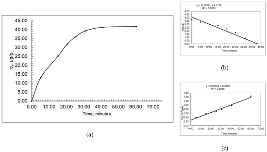 The obtained experimental data were tested with the pseudo-first-order kinetic model [27] (Equation (2)) and the pseudo-second-order kinetic model [28] (Equation (3)).