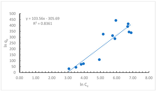 The obtained experimental results were fitted with the linearized equation of the Freundlich adsorption isotherm. The obtained curve is presented in Figure 3.