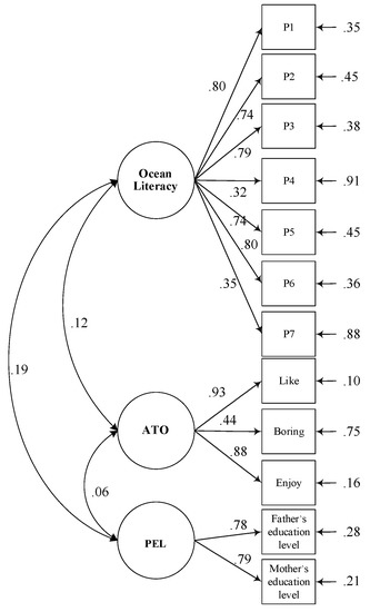 The goodness-of-fit statistics and indices were as follows: χ2 = 136.38; df = 51; p < 0.001; CFI = 0.980; TLI = 0.974; NFI = 0.969; RMSEA = 0.042; and SRMR = 0.034. Statistical significance at the 0.001 level was achieved for all of the standardized factor loadings of the observed variables in the measurement model. The composite reliabilities (CR) were 0.83, 0.83, and 0.85 for PEL, ATO, and ocean literacy, respectively. The values were all greater than 0.60, as recommend by Fornell and Larcker [30]. The average variance extracted (AVE) values were 0.72, 0.65, and 0.46 for PEL, ATO, and ocean literacy, respectively. They were all greater than 0.25, as recommended by Hair, Black, Babin, Anderson, and Tatham [31]. According to these results, the latent variables in this study were all somewhat valid and reliable.