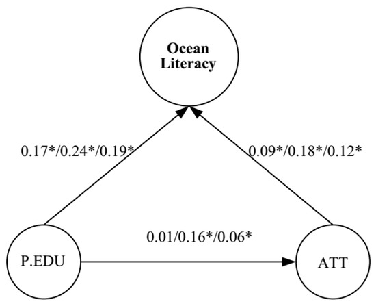Standardized estimates of relations and effect sizes in structural model. Note: Female group N = 396, male group N = 549, and total sample N = 945. PEL = parental educational level; ATO = attitude toward the ocean; the first value, second value, and third value shown are for the male group, the female group, and the total sample, respectively. * indicates statistically significant (p < 0.05).