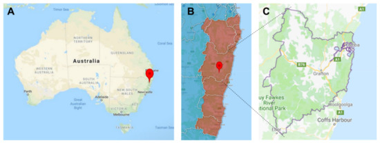 The Clarence Valley in the context of Australia (A, red marker); the North Coast Primary Health Network (B, red marker compared to the dark red shaded area) and the Clarence Valley Local Government Area alone (C, grey outlined area).
