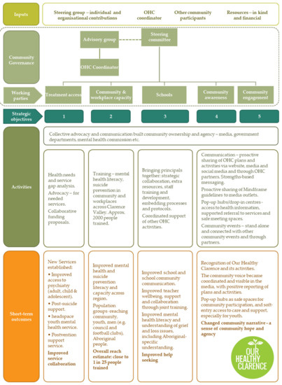 The Our Healthy Clarence (OHC) initiative is a comprehensive and upstream approach to suicide prevention. Its overarching goal is the promotion of health and wellbeing. It is a collaboration between the community, local government, health services, education, police, and community-managed organisations. While each organisation plays a significant role, the initiative is community-controlled. Understanding the process and factors for its implementation may support its continuation and inform other communities faced with similar challenges.