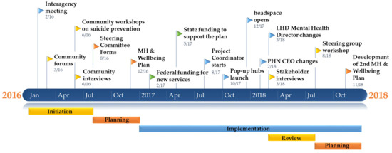Interviews were recorded, transcribed, de-identified and stored using NVivo 11 [27]. The quotes that are in this manuscript were selected as they represented a theme from the qualitative analysis. Document and inductive thematic analysis were used to identify themes and concepts within the transcribed interview data and the documentation [28,29,30]. This enabled the retrospective generation and validation of a program logic model and a key events timeline [31,32]. Feedback, verification and validation of findings were sought from key team members in a face-to face workshop and during successive iterations of this manuscript (RB, SH and SO). The project was approved by the University of Newcastle human research ethics committee (H-2017-0421).