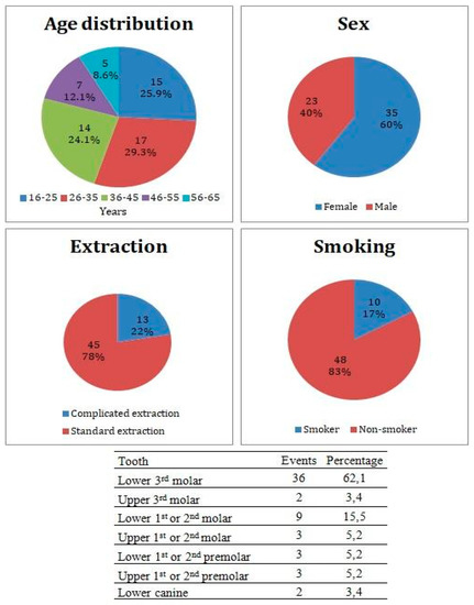 - Nusair, Y.M.; Younis, M.H. Prevalence, clinical picture, and risk factors of dry socket in a Jordanian dental teaching center. J. Contemp. Dent. Pract. 2007, 8, 53–63. [Google Scholar] [CrossRef]
