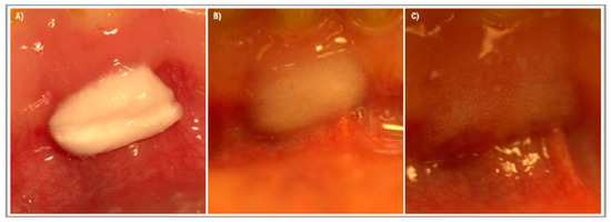 The effect of saliva on the tested medical device applied to the gums in the lower frontal area. The applied medical device was cut to the size 1 × 0.5 cm. (A) Right after administration, (B) 2 h after administration, and (C) 4 h after administration.