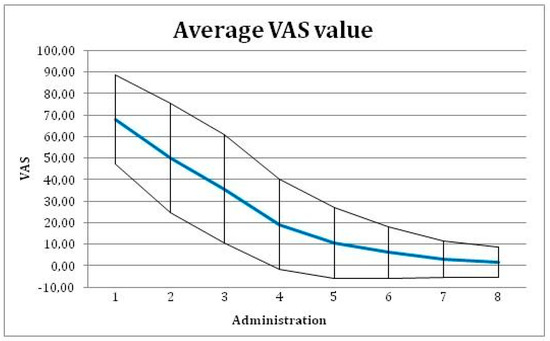 The extent of exposure, until the VAS value fell under 20 mm, was from 1 to 9 days, the mean value of 4.8 days, and a median of 4 days. On average, the pain fell under VAS 20 mm within 4 administrations at 40 of 50 patients, which represents 80% of patients.