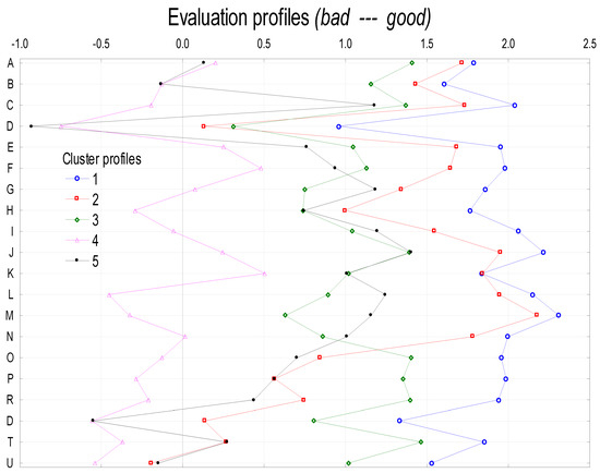 Five assessment profiles (clusters) of canteens were selected among the respondents (Figure 2). The first cluster (Eval. 1) found consumers (35%) who rated the functioning of canteens highly. The second cluster (Eval. 2) found people (22.8%) who rated canteens services highly but were critical of quality and prices. The third cluster (Eval. 3) included people (14.1%) who rated the functioning of the canteens high but were critical in many areas. The fourth cluster (Eval. 4) included people (9.5%) assessing the functioning of canteens critically. In the last cluster (Eval. 5) there were insightful and ambivalent people (9.1%).