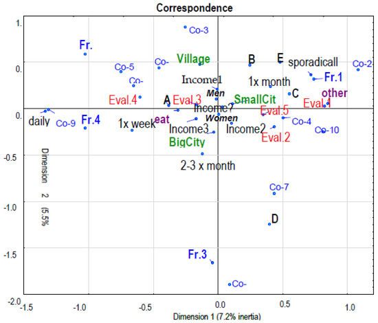 Figure 3. Correspondence graph of individual variants of respondents’ answers. University: A, B, C, D, E; Gender: Men, Women; Dwelling place: Village, Small City (City up to 100,000 inhabitants), Big City (City over 500,000 inhabitants); Financial status: Income 1—low, Income 2—average, Income 3—high, Income?—not given; Reasons: eat—meal’s consumption; other reasons—rest between lectures and classes, social meetings, preparing for classes, other; Profiles of general frequency of using the canteen: sporadically, once a month, 2–3 times a month, once a week, daily; Profiles of consumption: Co-1, Co-2, Co-3, Co-4, Co-5, Co-6, Co-7, Co-8, Co-9, Co-10; Profiles of frequency of use 8 types of meals: Fr.1, Fr.2, Fr.3, Fr.4; Profile of Evaluation: Eval. 1, Eval. 2, Eval. 3, Eval. 4, Eval. 5.