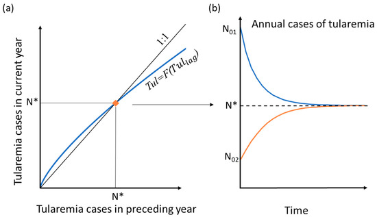 Conceptual diagram of resulting annual number of tularemia outbreaks under some given, unchanging hydroclimatic conditions, as a function of (a) corresponding number of outbreaks in the preceding year and (b) time. The blue curve in (a) shows the number of tularemia cases in the current year (Tul) as a function of the number of cases in the preceding year (Tullag); the intersection of the blue curve with the black 1:1 line at Tul=Tullag=N* identifies the expected endemic level for the (arbitrary) considered, unchanging hydroclimatic conditions. The blue and orange curves in (b) illustrate the general convergence over time to the endemic level Tul=N* (dashed line) for any initial Tullag value (N01, N02) under the given unchanging hydroclimatic setting.