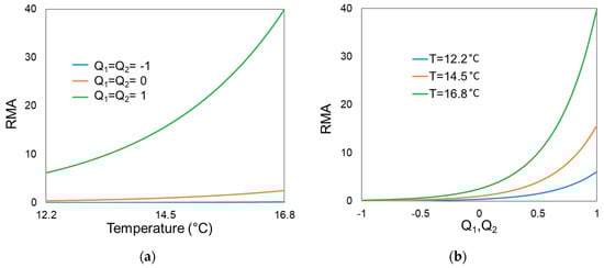 Relative mosquito abundance (RMA) as a function of (a) mean temperature (T) 1–7 days before evaluation time t, and (b) maximum standardized river flows (in associated standard deviations) Q1 and Q2 at time periods 36–42 days and 22–28 days, respectively, before time t. The results in (a) are for different Q1 and Q2 values (in associated standard deviations) and the results in (b) are for different T values. All Q1, Q2, and T values considered are within their respective observation-based value ranges.