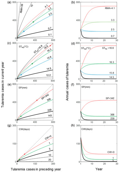 Resulting number of outbreaks and endemic level of tularemia for different hydroclimatic conditions in terms of (a,b) relative mosquito abundance (RMA) (hydroclimatically determined), (c,d) summer temperature in preceding year (STlag), (e,f) summer precipitation (SP), and (g,h) number of cold winter days with low snow coverage (CW). Panels on the left (right) show tularemia cases (solid colored lines) in current year as a function of cases in the preceding year (time), for different given values of the specific hydroclimate variable considered in each panel, and an initial number of 200 cases (all panels). Dot-dashed lines in the left-hand panels indicate results for observed minimum and maximum hydroclimatic variable values, while the bold line indicates the observed median variable value. The dashed lines in the right-hand panels show the resulting endemic levels (crosses in the left-hand panels).