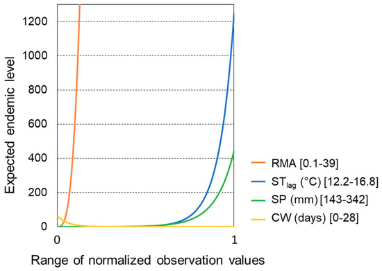Using a previously tested and validated statistical disease model, we computed model-implicit expected endemic levels of tularemia with hydroclimatic variable values within their respective ranges of observations. We demonstrated that the computed expected endemic level can be used as a comparative index for analyzing the sensitivity of tularemia outbreaks to hydroclimatic conditions and for identifying critical hydroclimatic thresholds to high-risk outbreak conditions. Our analysis revealed that tularemia outbreaks are most sensitive to relative mosquito abundance (RMA) and associated underlying periodic hydroclimatic conditions of flow (Q1 and Q2) and mean temperature (T), followed by summer temperature in the preceding year (STlag) and summer precipitation in the current year (SP). Number of cold winter days with low snow coverage (CW) has the least influence on outbreaks and is the only hydroclimatic variable with a negative relationship with outbreaks, i.e., number of outbreaks and endemic level decreased with increasing CW (Figure 3g,h, Figure 4 ).