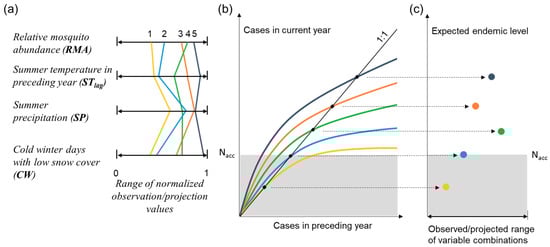 Schematic illustration of how hydroclimatic thresholds to hazardous endemic levels of disease can be identified. The colored curves and symbols show (a) examples of hydroclimatic variable value combinations (1–5; different colored lines) within the respective observed/projected value range of each variable; the different points that each line passes through in the four normalized axes represent the values of relevant variables in this hydroclimatic setting; (b) number of disease cases as a function of number of cases in the preceding year (as explained in Methods, this function can be obtained by substituting values of the four relevant variables from panel (a) into the model), and endemic level (filled black squares) for the hydroclimatic combination examples (1–5, with similarly colored lines as) in panel (a), compared with the maximum societally acceptable endemic level (Nacc, upper boundary of gray zone); and (c) endemic levels (filled colored circles) for each hydroclimatic combination example (1–5, with similarly colored symbols as the corresponding curves) in panel (a), plotted in relation to the observed/projected variable range (illustrated here for simplicity in just one dimension, the x-axis, whereas the actual range space is multi-dimensional depending on the number of hydroclimatic variables considered).
