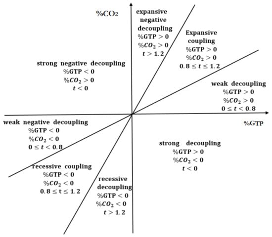 Based on Tapio’s division of decoupling coefficient between carbon emissions and economic development, we drew a picture of a decoupling model between carbon emissions and economic development in transport sector, as shown in Figure 1.