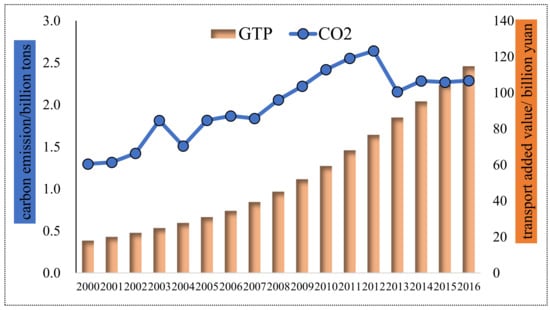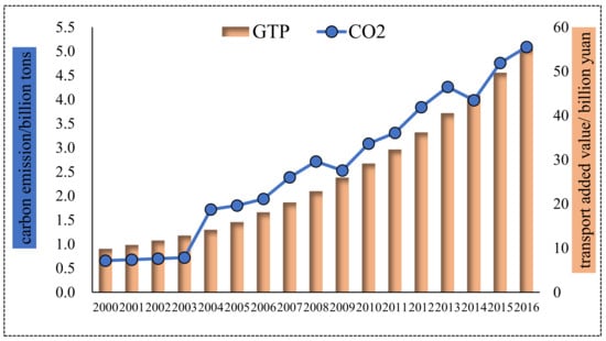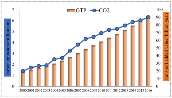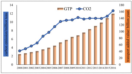 As evidently depicted in Figure 5, transport’s carbon emissions experienced two stages: relatively stable in 2000–2003 and increased with fluctuation in 2003–2016. Overall, carbon emission increased from 0.66 Mt in 2000 to 5.09 Mt in 2016, increased by 4.43 Mt with a quite high annual growth rate of 13.66%. For transport’s added value, it presented a continuous increasing trend, from 9.82 billion yuan to 55.16 billion yuan in the period of 2000–2016, with a rather high annual growth rate of 11.39%. What deserves to be highlighted is that though transport’s carbon emissions and added value grew with high speeds, the former grew faster than the latter. It uncovered that transport development is closely connected with energy consumption and carbon emission, which will hinder carbon reduction and low-carbon economy construction, and require more effort to improve the poor situation.