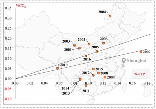 As shown in Table 3, Shanghai’s transport sector improved from expansive negative decoupling to weak decoupling and appeared with the trend of strong decoupling. The carbon-reduction effect almost accelerated weak decoupling prior to 2007 and strong decoupling for the remaining years. It uncovered that Shanghai’s transport sector positively shifted from carbon intensive energy to low-carbon energy under the umbrella of energy transformation; for example, the ration of fuel oil decreased from 64.93% to 37.49% in 2000–2016, raw coal decreased from 3.67% in 2001 to 0.05% in 2016, and natural gas increased from 0 to the highest ratio of 0.43% in 2000–2016. The energy-saving effect significantly promoted transport’s economic growth to strongly decouple from carbon emission, except in a few years. Especially in 2003–2004, Shanghai’s transport sector appeared with expansive coupling and expansive negative decoupling. Since then, China joined the World Trade Organization (WTO), so the transport sector rapidly developed, without enough attention paid to energy-saving and carbon-reduction [,]. The transport share changed from strong decoupling to weak decoupling. The economic scale effect had a better impact on the decoupling situation of Shanghai’s transport sector, changing from expansive coupling to weak decoupling. Like Beijing’s transport sector, the population scale effect also stably promoted Shanghai transport’s economic growth to weakly decouple from carbon emission and the impact is gradually strengthening.