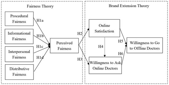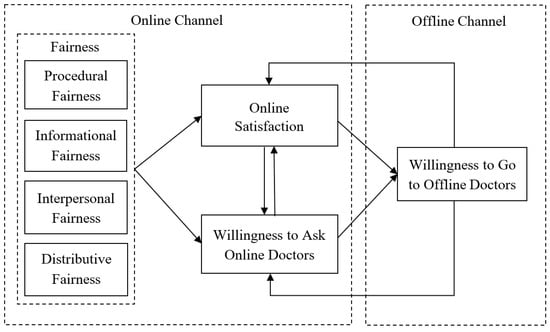 To fill this research gap, this study integrates fairness theory and brand extension theory to develop a research model. Given that the four sub-dimensions of fairness perception (i.e., distributive fairness, procedural fairness, interactional fairness, and informational fairness) can measure an individual’s comprehensive evaluation of online services [7], fairness theory explains the relationships between online patient–doctor communication and behavioral intentions. Additionally, the theory can be explained by social exchange theory, because patients pay money and spend time when asking for and receiving the expertise of online doctors. Considering that brand extension has been widely used to explain interrelations between multiple channels [8], brand extension theory is applied in this study to examine the relationship between online and offline behavioral intentions. Brand extension theory attempts to explain the positive impact of brands when a product enters a new market [8]. Consequently, if the patient is satisfied with the online doctor’s consulting services, he/she is more likely to converse with the same doctor again on the online health platform. On the other hand, in online-to-offline commerce, the patient is likely to be inclined to follow online doctors’ suggestions and visit an identical doctor for further treatment of the same health issue in an offline hospital, when he/she is satisfied with online counseling.