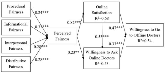 This study examined the SEM by testing the hypothesized relationships between nine variables (Figure 3). The results show that procedural fairness (β = 0.24, p < 0.001), informational fairness (β = 0.33, p < 0.001), interpersonal fairness (β = 0.28, p < 0.001), and distributive fairness (β = 0.28, p < 0.001) have a significant effect on the overall perceived fairness, supporting H1a to H1d. Perceived fairness (β = 0.28, p < 0.001) significantly affects online satisfaction. The model accounts for 68% of the variance in online satisfaction, supporting H2. Perceived fairness (β = 0.23, p < 0.01) and online satisfaction (β = 0.53, p < 0.001) have significant effects on the willingness to ask online doctors, supporting H3 and H4. The variables explain 53% of the variance in the willingness to ask online doctors. Satisfaction (β = 0.47, p < 0.001) and the willingness to ask online doctors (β = 0.33, p < 0.001) have a significant effect on the willingness to go to offline doctors, supporting H5 and H6. The variables explain 54% of the variance in the willingness to go to offline doctors.