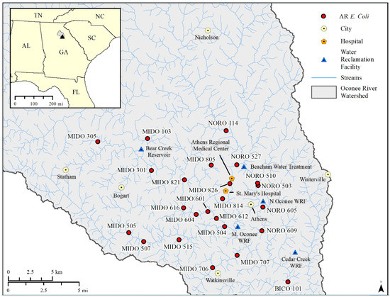 Map of water sampling sites in the Upper Oconee Watershed near Athens, GA. Sampling sites where antimicrobial resistant E. coli were isolated are labeled and are symbolized as red circles. Points of interest (circles—cities, triangles—water reclamation facilities, and pentagons—hospitals) are also labeled. The National Hydrography Dataset (NHD) streams are shown for reference. Inset map shows the Upper Oconee watershed in grey and Athens, GA, as a black triangle.